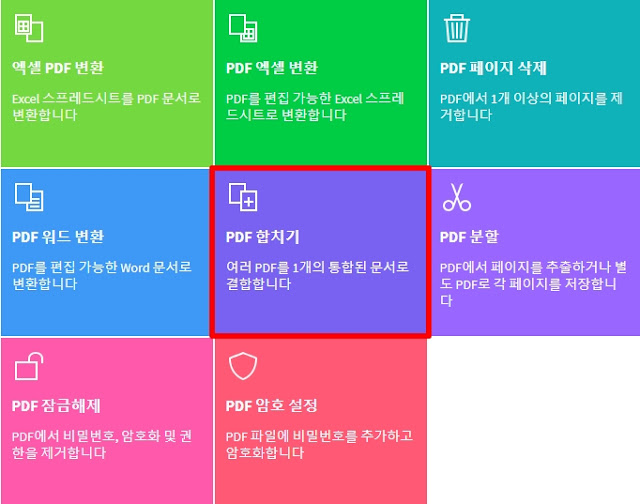 PDF파일을 합치기 위해선 첫 화면으로 이동해 "PDF분할"메뉴의 바로 왼쪽에 있는 "PDF합치기"를 클릭한다.